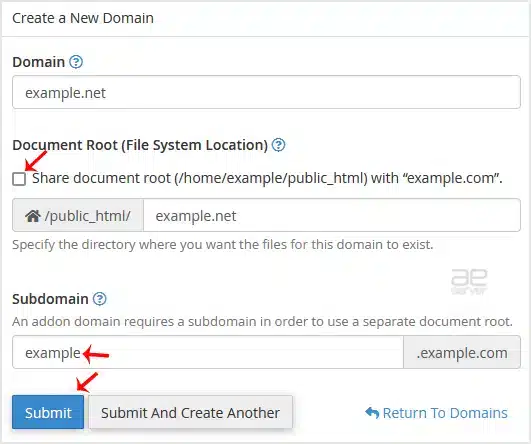 - Share document root: Must uncheck it to create your subdomain.