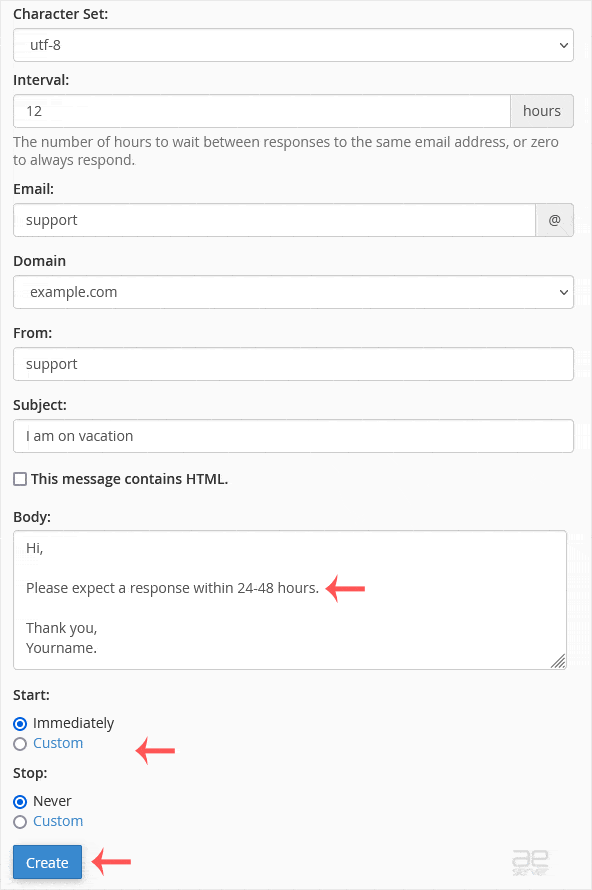 - Interval: Specify the number of hours you wish the autoresponder to wait between responses to the same email address.