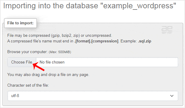 5. Under File to import, click on Choose File and select SQL file from your computer.