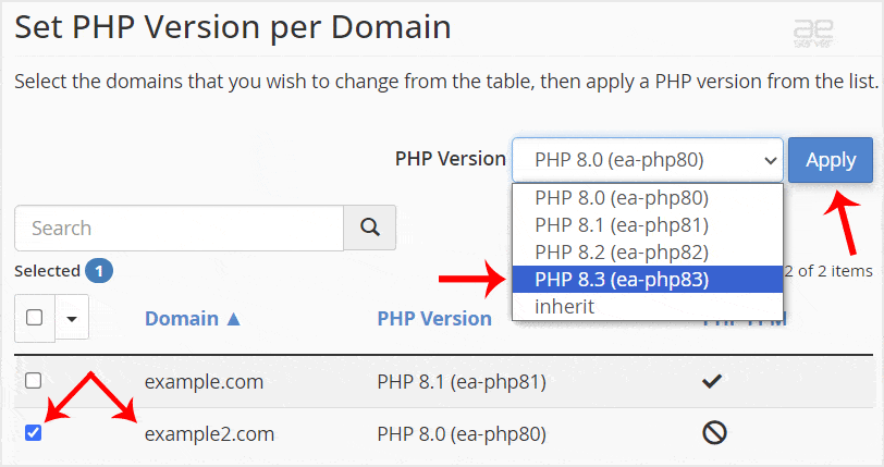 4. Now we will set PHP 8.3 on Example2. Scroll down and select the example2 domain. Then choose the PHP version as 8.3 and click apply.