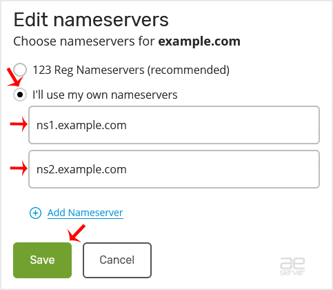 5. Choose the “I’ll use my own nameservers” option, and enter your nameservers in the designated fields.