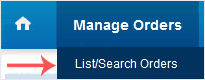 2. After a successful login, click on List/Search Orders from the Manage Orders drop-down menu.